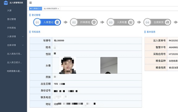 粮库业务功能集成了粮食数量、车辆装卸货数量、粮库绑定、能源消耗统计、出入库业务全流程、财务结算、质检统计、痕迹溯源等功能,实现粮食出库、入库业务全流程标准化、实时化、智能化管控、规范流程、规避风险。
